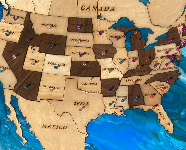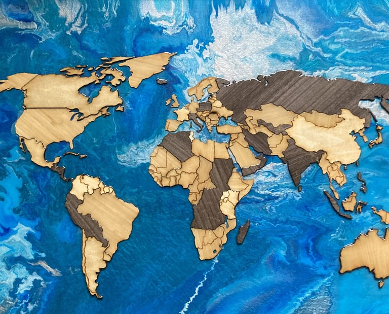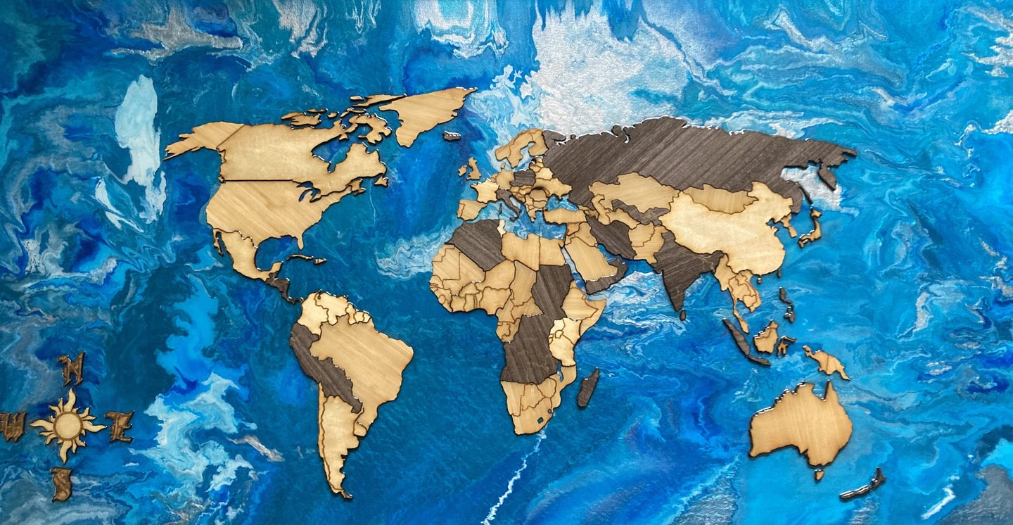 This wall mounted map features three different types of materials of varying thickness: basswood, bamboo, and walnut plywood, all laser cut and hand assembled. The background is an acrylic pour over a heavy duty 2'x4' canvas. The whole piece is finished with a coat of epoxy over the top, to give it a glossy sheen.